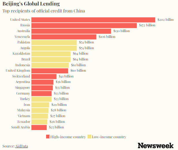 طبق گزارش «نیوزویک» و بر اساس نتیجه این مطالعه که دادههای ۲۴ ساله را تحلیل کرده، ایالات متحده بزرگترین دریافتکننده وام از چین در سطح جهان است و همین امر تصور عمومی را که چین بیشتر بر کشورهای در حال توسعه تمرکز دارد، به طور کامل نقض میکند.